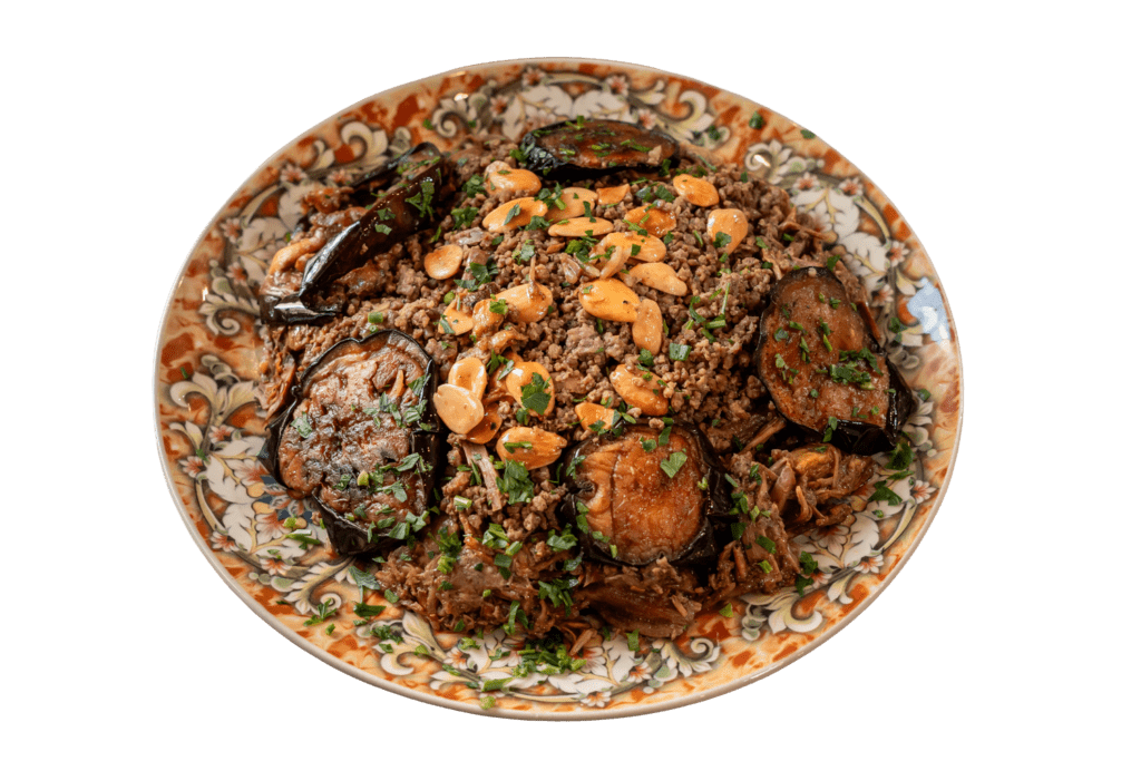 Prueba nuestra auténtica Maqluba con carne, un plato tradicional árabe preparado con arroz, verduras y carne tierna, cocinado lentamente con especias que despiertan todos los sentidos.